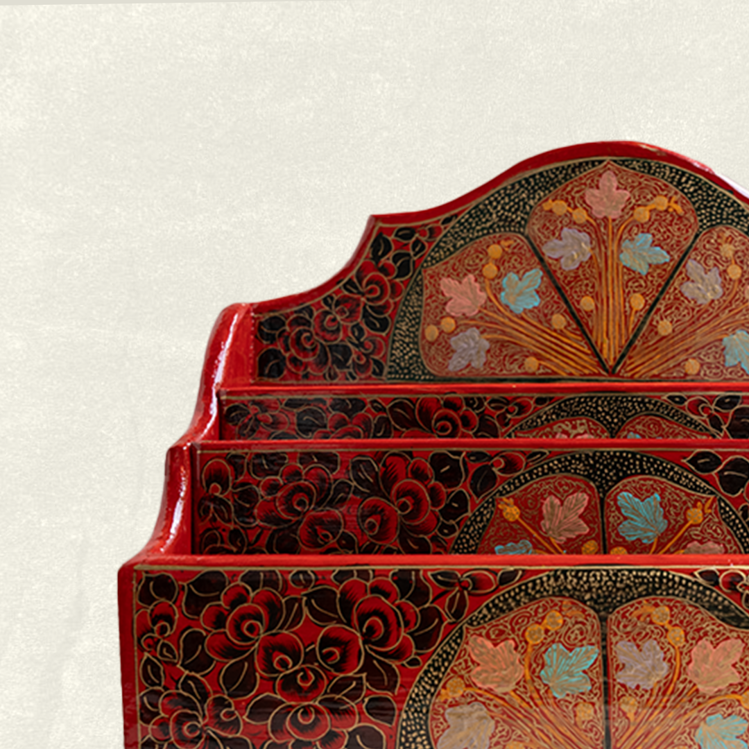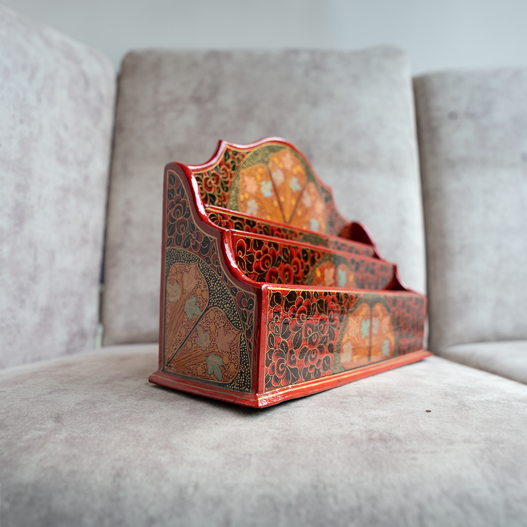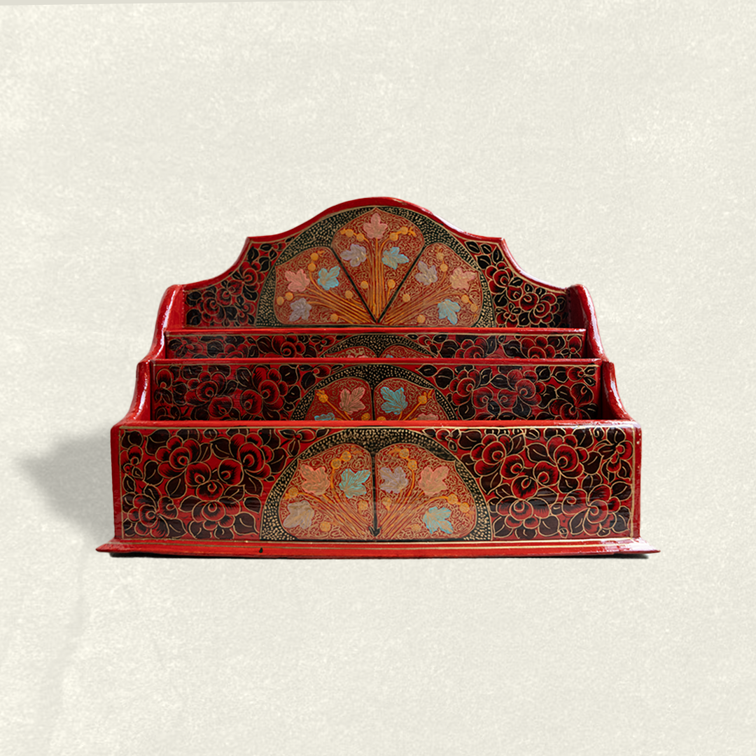 The hand-painted details create a focal point, turning a simple organizer into a decorative accent. This paper mache red paper organizer is not just a functional tool; it's a testament to artisanal skill and a beautiful addition to your home or office. Streamline your workspace and add a touch of handcrafted expression with this functional and stylish organizer.